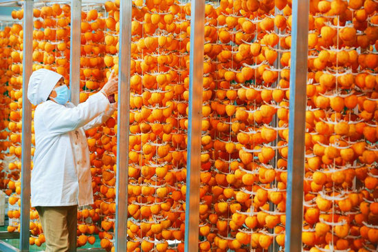 工人正在将预加工的柿子挂在晾晒架上准备烘干。新华社记者 邹尚伯 摄