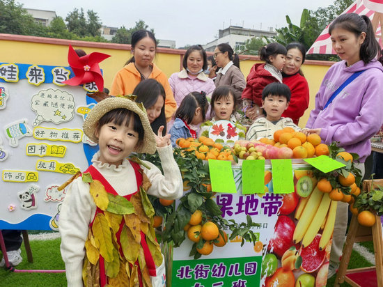 在节奏感十足的音乐声中,孩子们的秋日装扮秀闪亮开启。孩子们身着亲子自制的秋日创意皇冠、面具、披风、长裙等走秀,点燃现场气氛。随后的“北街市集”中,孩子们有的和家长一起在摊位上当起小老板,有的孩子在家长陪伴下穿梭于摊位之间,他们或交易南瓜、红薯等农产品,或购买橘子、红提等当季水果,或参与“果实套圈圈”“南瓜滚滚来”等游戏,还有各种自制的手工作品。锻炼社交与动手能力。