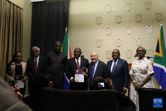 11月4日,在南非立法首都开普敦,二十国集团应对全球不平等问题特别独立专家委员会主席、诺贝尔经济学奖得主约瑟夫·施蒂格利茨(右三)和专家委员会成员向南非总统拉马福萨(右四)提交关于全球不平等问题的报告。新华社发(沙姬拉·泰比摄)
