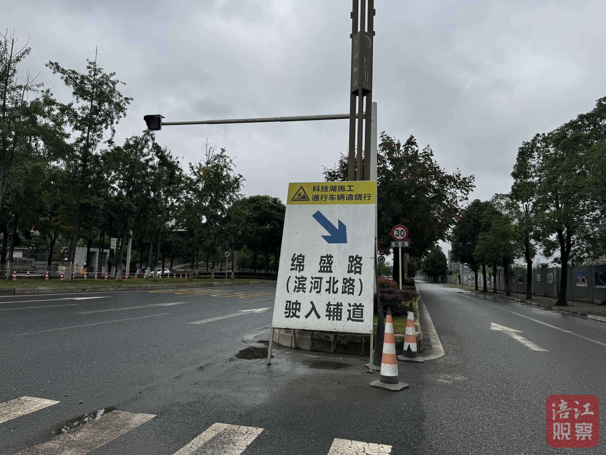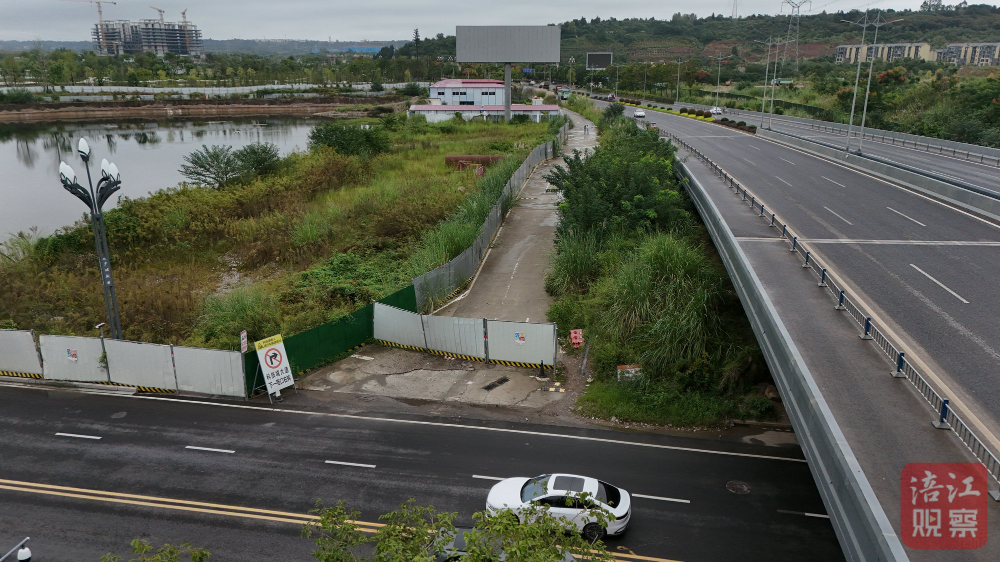 “这条辅道在科技湖公园施工和滨河路改造时,作为施工便道供工程车辆通行。”蒋代林解释说,“今年初科技湖公园开园后,社会车辆明显增多,但是当前辅道旁还有一个在建的‘科技展厅’项目,因为滨河路上有限高杆,所以该项目施工时工程车辆还需要通过该辅道进行调头、通行,所以如果社会车辆通行就存在安全隐患。”蒋代林解释说。