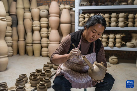 11月5日,村民在云南省曲靖市潦浒村的陶坊内制作陶器。