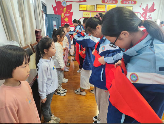 活动现场,老队员们怀揣着对少先队精神的崇敬,小心翼翼且无比庄重地为新队员佩戴红领巾。当那一抹鲜艳的红色如火焰般在新队员胸前飘扬时,新队员们的眼眸中闪烁着自豪的光芒,稚嫩的脸庞上满是难以掩饰的喜悦。这一时刻,不仅是红领巾的交接传递,更是爱党爱国的赤诚精神与少先队光荣传统跨越时光的赓续传承。