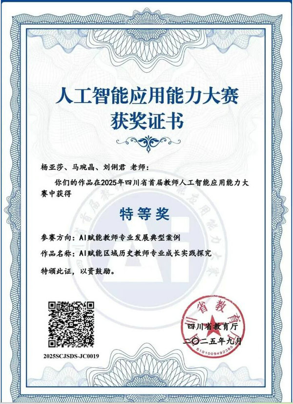在四川省首届教师人工智能应用能力大赛中,马琬晶、刘俐君老师以AI赋能历史教学为核心,有效破解了传统课堂痛点,荣获特等奖。
