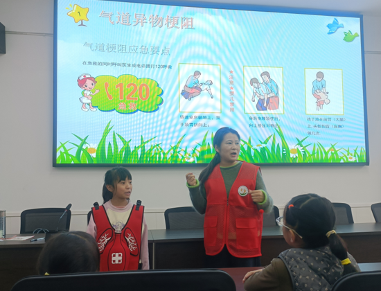在讲授环节,老师用课件, 动画短片讲授“气道异物梗阻”“溺水”“中暑”等日常场景风险,搭配朗朗上口的安全口诀,让孩子快速记忆。