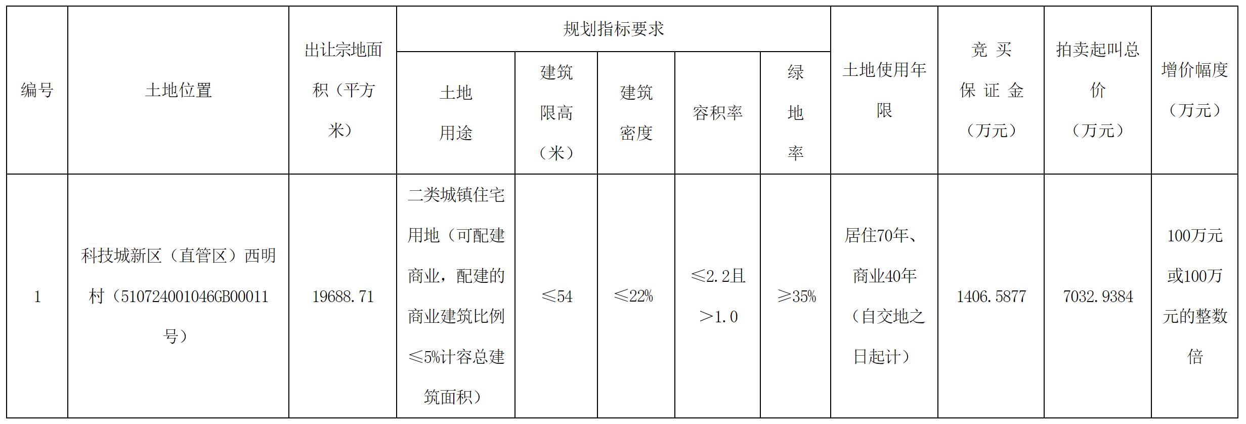 经绵阳市人民政府批准,绵阳科技城新区管理委员会决定以拍卖方式出让一宗国有建设用地使用权,绵阳市公共资源交易服务中心具体组织实施本次拍卖出让活动,现将有关事项公告如下: