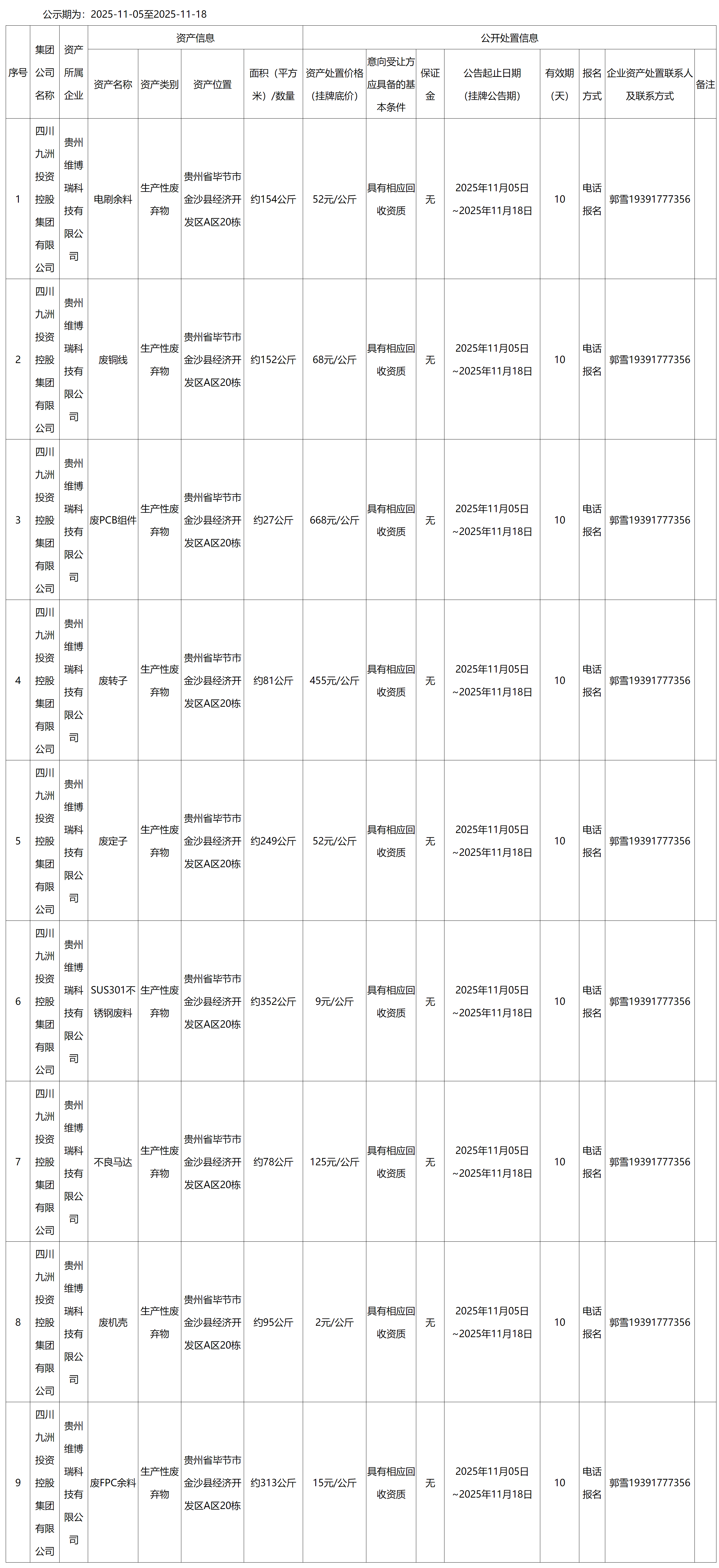 贵州维博瑞科技有限公司生产废料资产处置公告