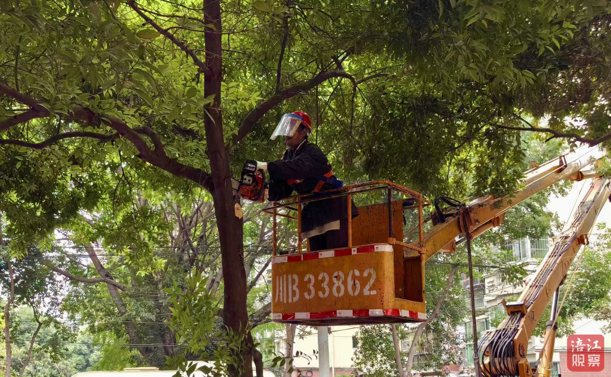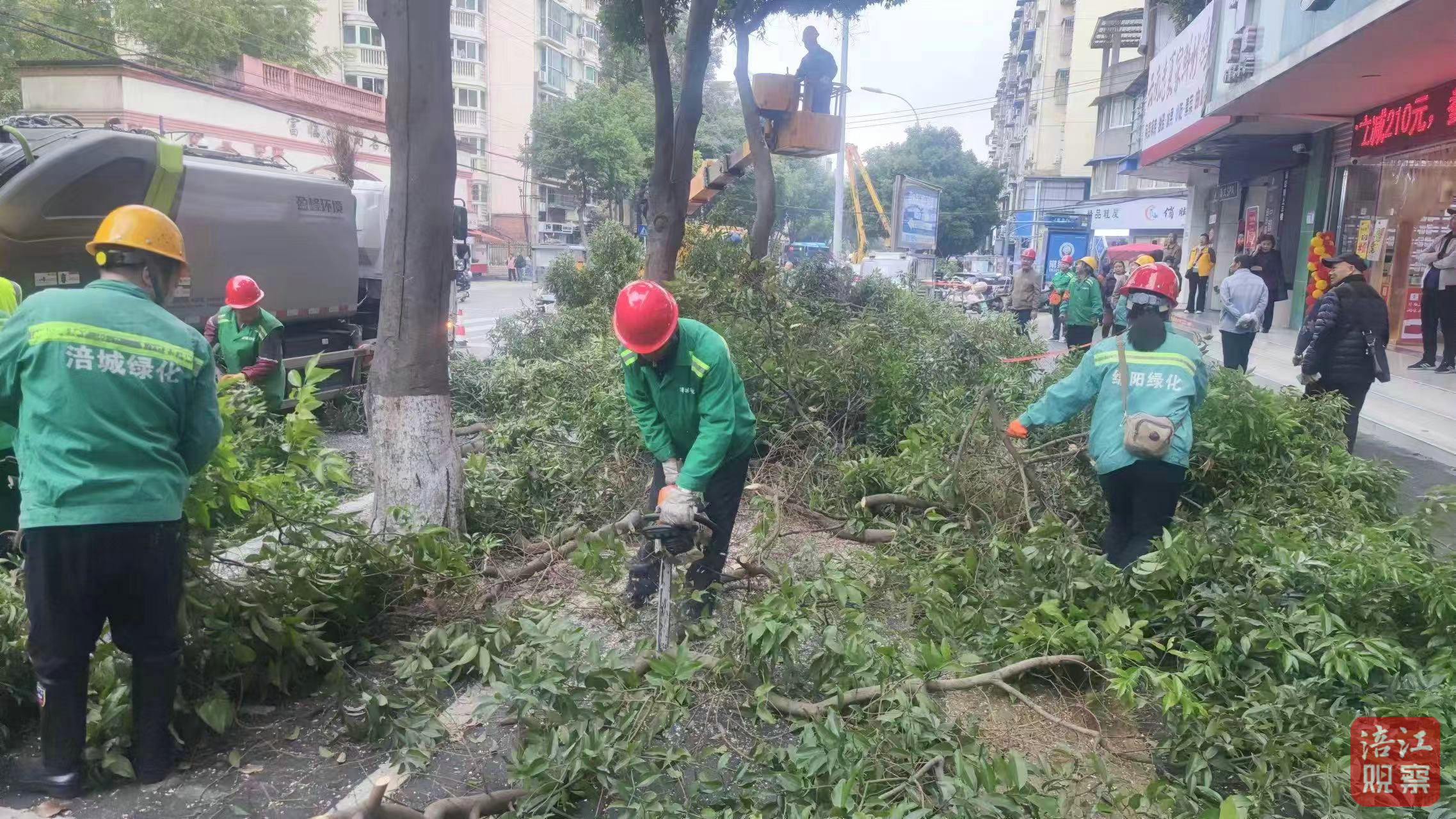 11月10日,跃进路北段的修剪现场,高空作业车将涪城区的绿化工人们稳稳托起,他们头戴安全帽,手持油锯,眼神专注。随着油锯嗡鸣,过密、杂乱的枝条应声而落,动作干净利落。地面上,有人指挥高空作业,确保安全;有人将剪落的枝条整理、分段,送入木料粉碎车。环卫工人紧随其后清扫碎屑,整个过程高效流畅。