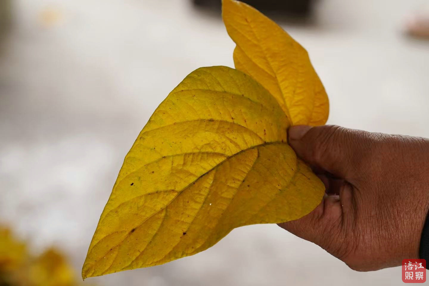 刘从林说:“采摘技术不难,只要没有虫眼就行。像这种有虫眼的就不能要,要选黄色的、没有病斑的。叶子黄了就可以摘,一天摘50斤完全没问题。”