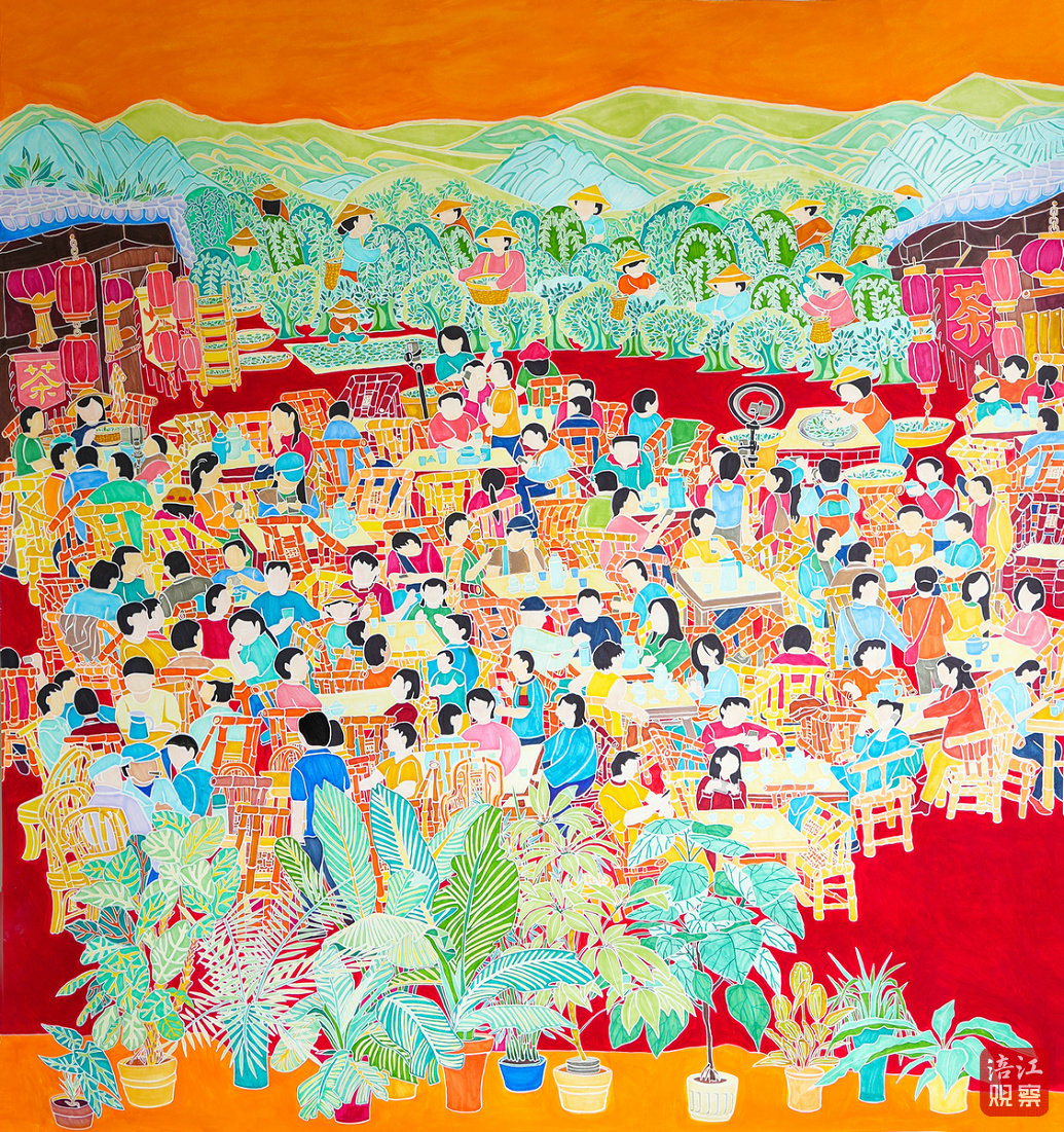 杨若雪的《茶香传薪新·享茶品丰饶》构图以几何化梯田、圆桌茶宴构建秩序感,夸张变形的人物轮廓与茶树形态释放情感张力,形成“拙中藏巧”的视觉语言。作品画面中,前幅呈现茶农古法采茶、晒青、炒制,与网络直播卖茶光影交织,传统技艺与数字浪潮在茶香中对话;后幅游客围坐茶宴,笑语随茶汤漾开,品茗升华为乡村美学仪式。作品以“薪火”续文化基因,以“丰饶”绘产业图景,在乡土烟火中熔铸时代精神。观者既见茶山律动,亦品振兴史诗。