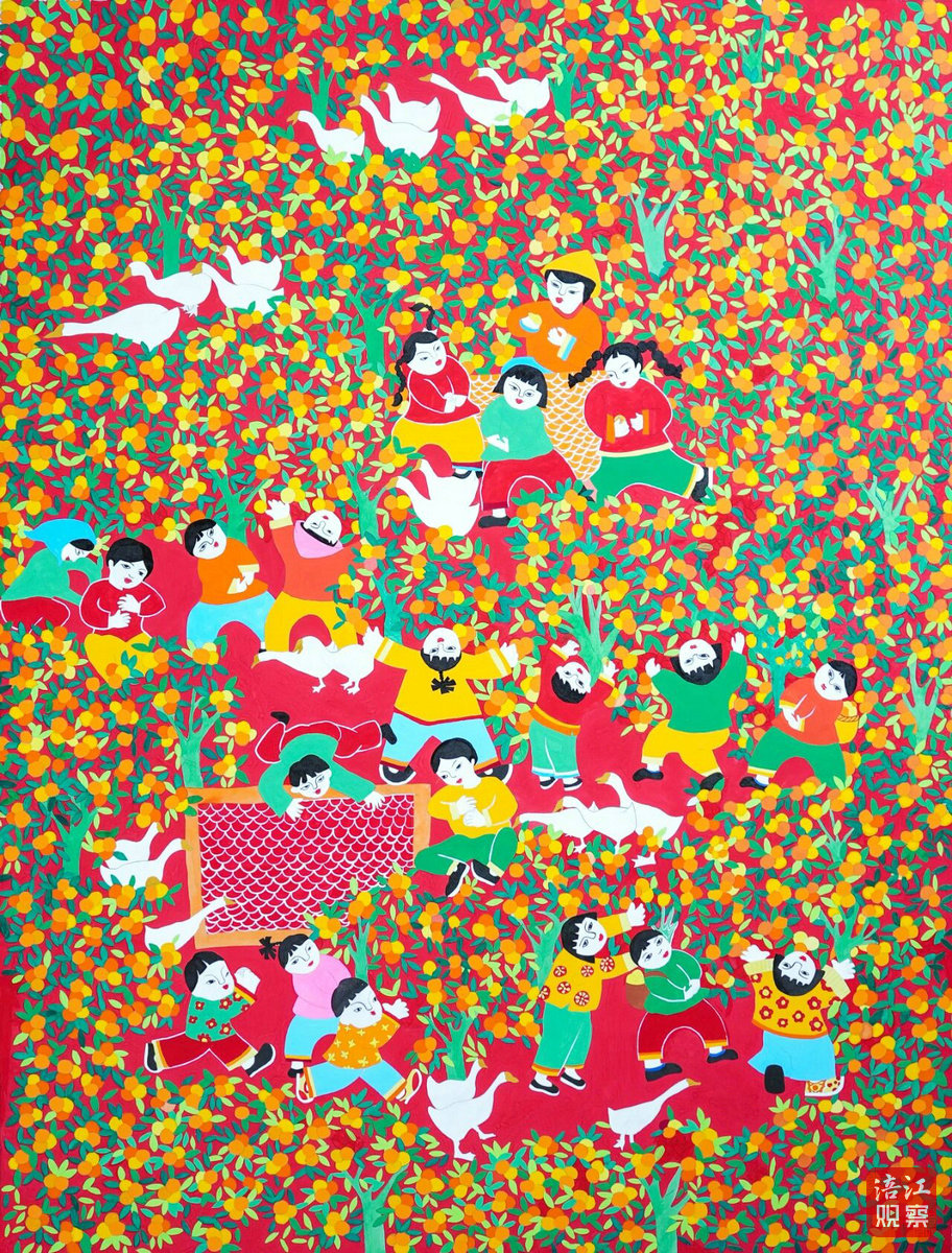陈维兵的《幸福果农》源于乡村生活,描绘了劳动情景和幸福生活的景象,通过夸张的造型和浓烈的色彩,生动刻画村民协作劳动的场景。作品画面风格吉祥喜庆,表现了老百姓乐观向上的生活追求和审美情趣。作品画面色彩绚丽浓烈,装饰平和自然,线条简练,凸显农民画质朴奔放的艺术特色,表现了老百姓对美好生活的向往以及对真善美的渴望与追求。