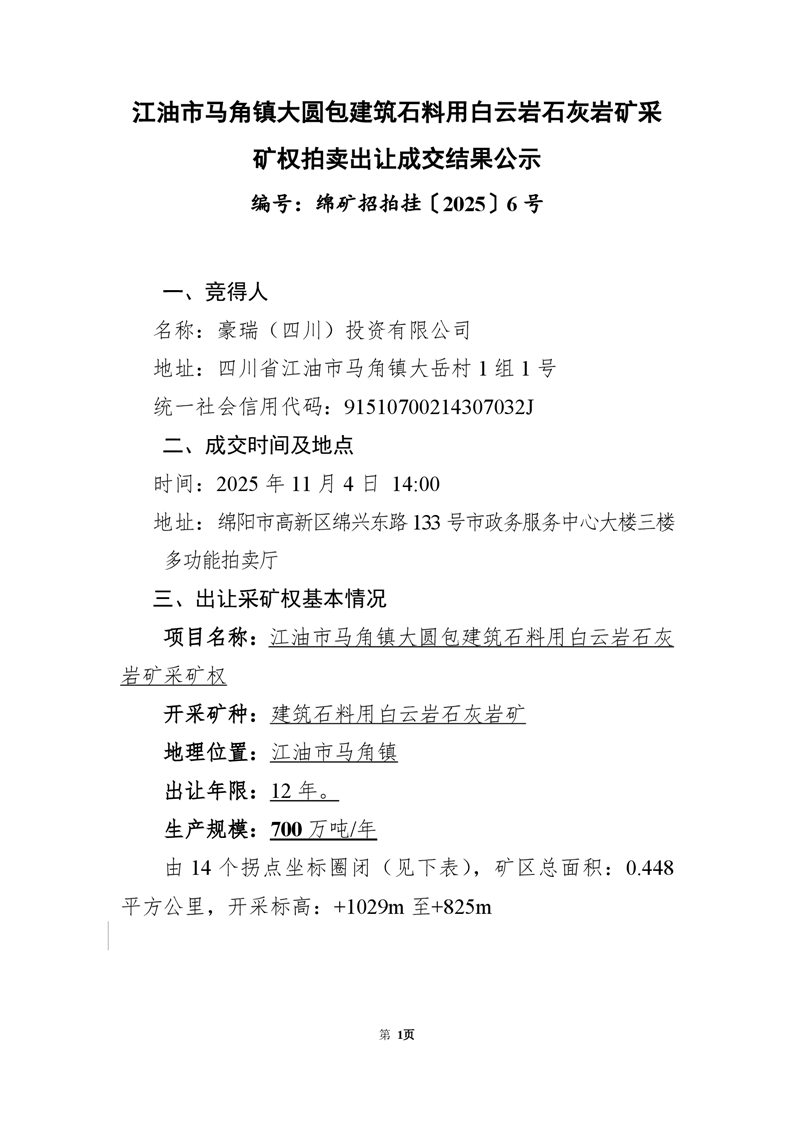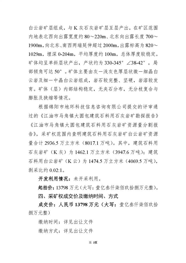 江油市马角镇大圆包建筑石料用白云岩石灰岩矿采矿权拍卖出让成交结果公示(绵矿招拍挂〔2025〕6号)