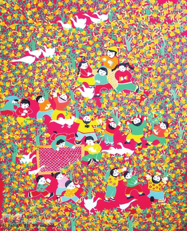 陈维兵的《幸福果农》扎根乡村生活,聚焦劳动场景与幸福生活景象。作品通过夸张的造型和浓烈的色彩,生动刻画村民协作劳动的画面,风格吉祥喜庆,传递出老百姓乐观向上的生活追求与审美情趣。画面色彩绚丽浓烈,装饰感平和自然,线条简练利落,既凸显农民画质朴奔放的艺术特色,也表达了老百姓对美好生活的向往,以及对真善美的渴望与追求。