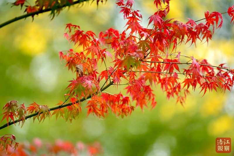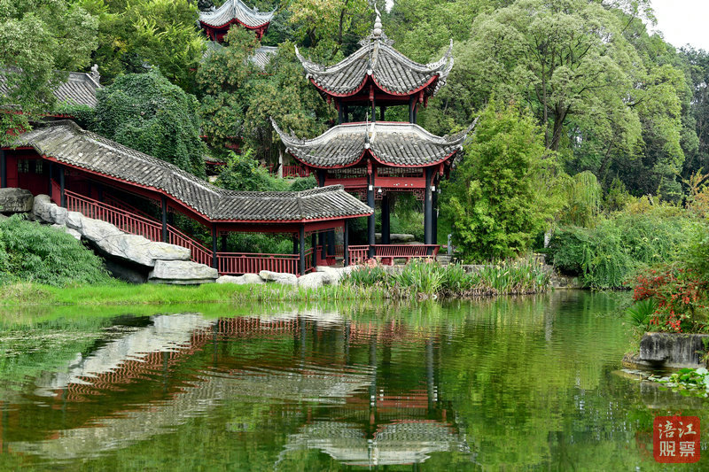 绵阳城区西山公园、富乐山公园、松桠日新公园等仿古园林显得静谧而优雅,亭台楼阁、单孔拱桥、青瓦围墙与色彩斑斓的红枫、银杏树交相辉映,勾勒出一派古韵雅趣的园林意境。