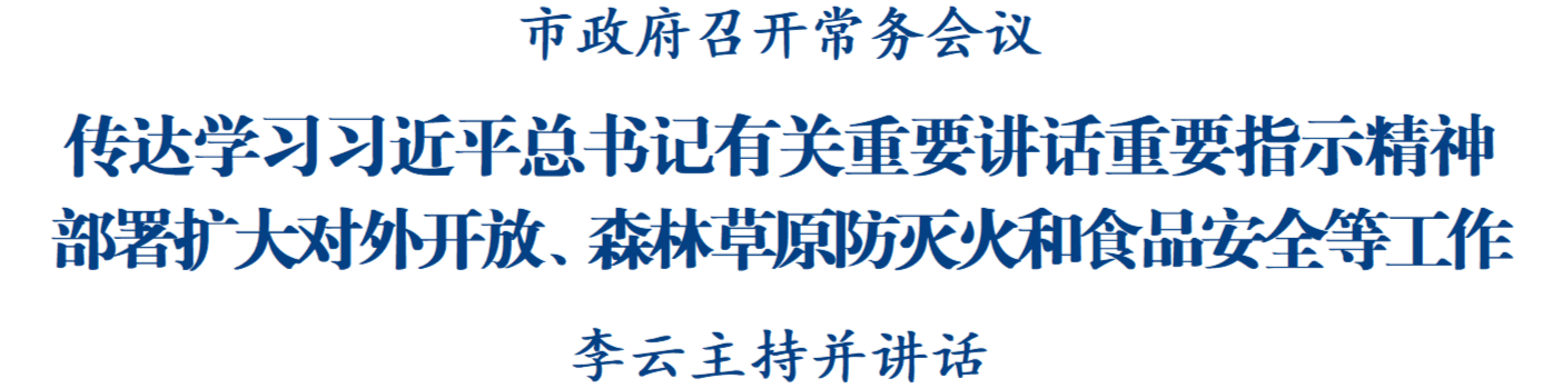 11月17日,市政府召开第122次常务会议,传达学习习近平总书记有关重要讲话重要指示精神,部署扩大对外开放、森林草原防灭火和食品安全等工作。市委副书记、市长李云主持会议并讲话
