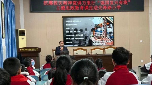 绵阳新闻网讯 近日,绵阳市先锋路小学在班会课上开展了以“精神如炬照童心,强国复兴担使命”为主题的抗震救灾精神宣讲活动。本次活动特邀绵阳市抗震救灾精神宣讲团成员、四川省中共党史学会理事景富国老师担任主讲,为全校师生带来一场深刻而动人的精神洗礼。