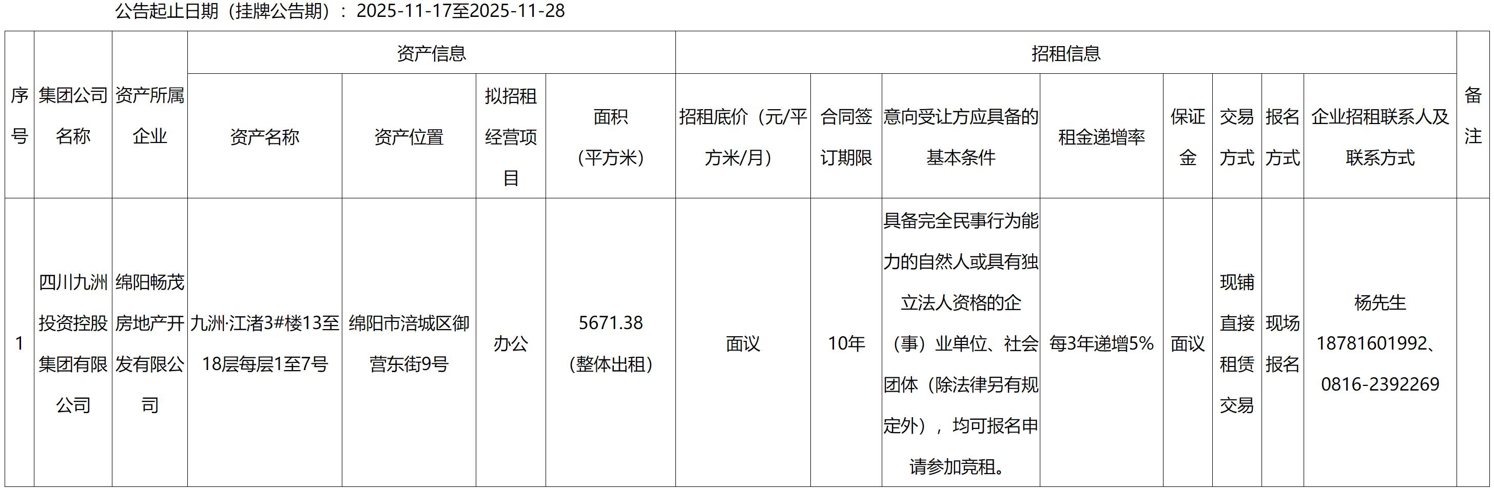 四川九洲千城商业管理有限公司涪城项目部九洲江渚项目房屋出租公告