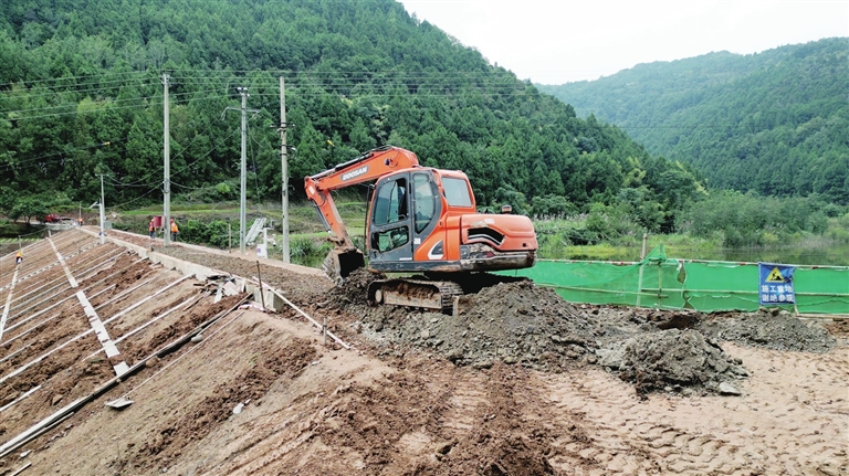 挖掘机开展坝体加固作业。记者 彭紫薇 摄