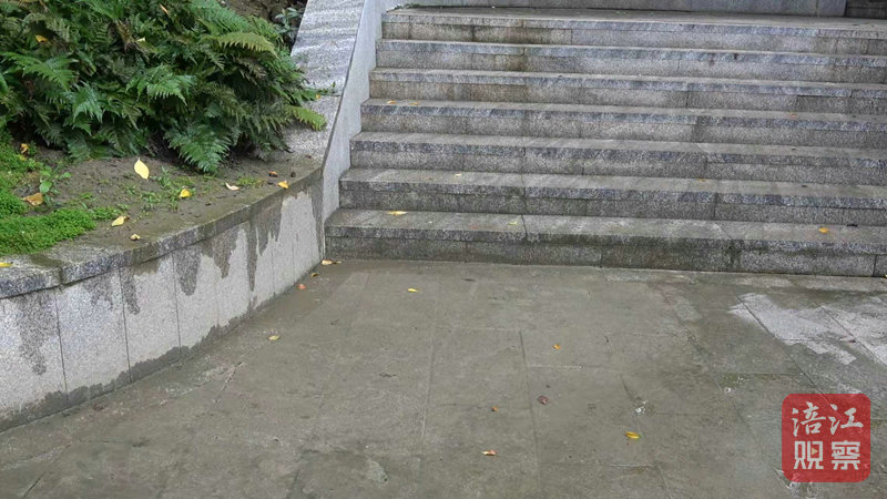 天桥下的台阶则是另一处“重灾区”。记者看到,台阶表面几乎被旁边绿化带溢出的泥土覆盖,部分区域同样长了青苔,踩上去黏滑泥泞,行走十分困难。“这边更滑!泥巴都溅到地面上了,根本不敢走。”一位市民指着台阶无奈说道。