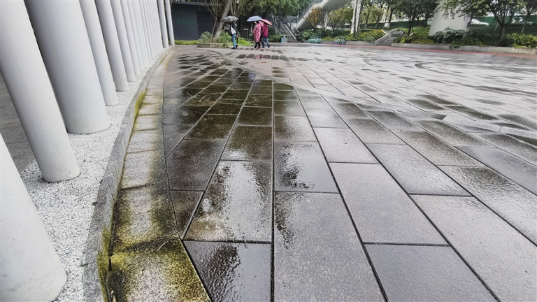 近日,一场雨后,记者实地探访发现,该处广场廊架下的地砖表面附着明显青苔,雨水浸润后更显湿滑,多位市民向记者反映:“几乎每天都有人在这里摔倒。”