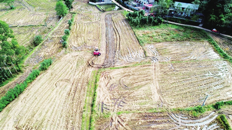 同一天,在安州区黄土镇盐井村,刚刚完成水稻收割的田地里还留着一排排稻茬,3台大型播种机已驶入田间展开作业。伴随着机械的轰鸣声,一块块田地被快速整理成疏松平整的苗床。