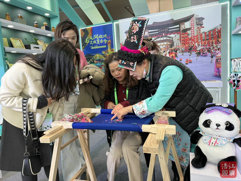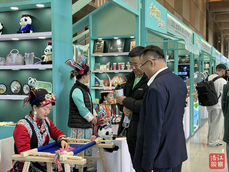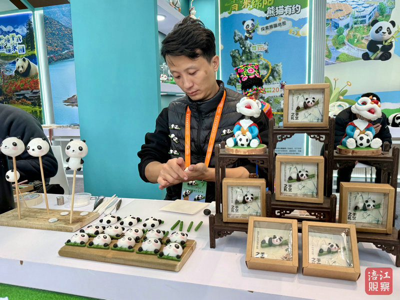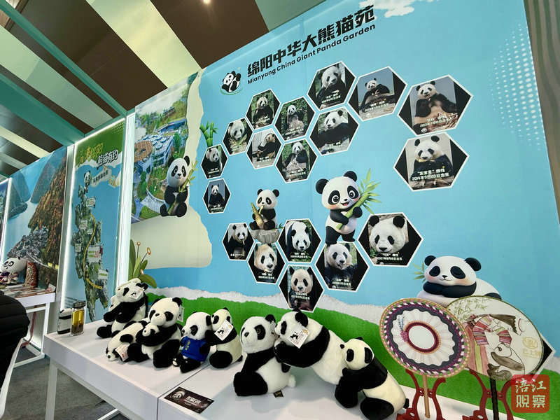 在展区一侧,绵阳以“青睐绵阳 熊猫有约”文旅品牌为主题,共设置了绵阳中华大熊猫苑、平武、北川三个展位,携非遗项目活态展演和200多件文创产品亮相。从剪纸到羌绣,从面塑到草编,从手办到潮玩,创意无穷的熊猫形象,充分展示了绵阳对熊猫IP的无限想象力,现场气氛热烈,吸引众多国内外嘉宾驻足参观。