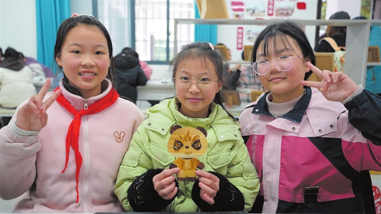 三台新生小学学生展示麦秆烙画作品。 记者 刘凤君 摄