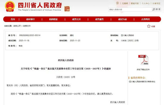 据四川省人民政府网站消息,为加快交通强省建设,补齐水运基础设施短板,推动物流降本提质增效,更好服务全省经济社会发展,结合水运发展实际,近日,省政府印发了《“畅通一条江”航运振兴发展集中攻坚三年行动方案(2025—2027年)》(以下简称《方案》)。