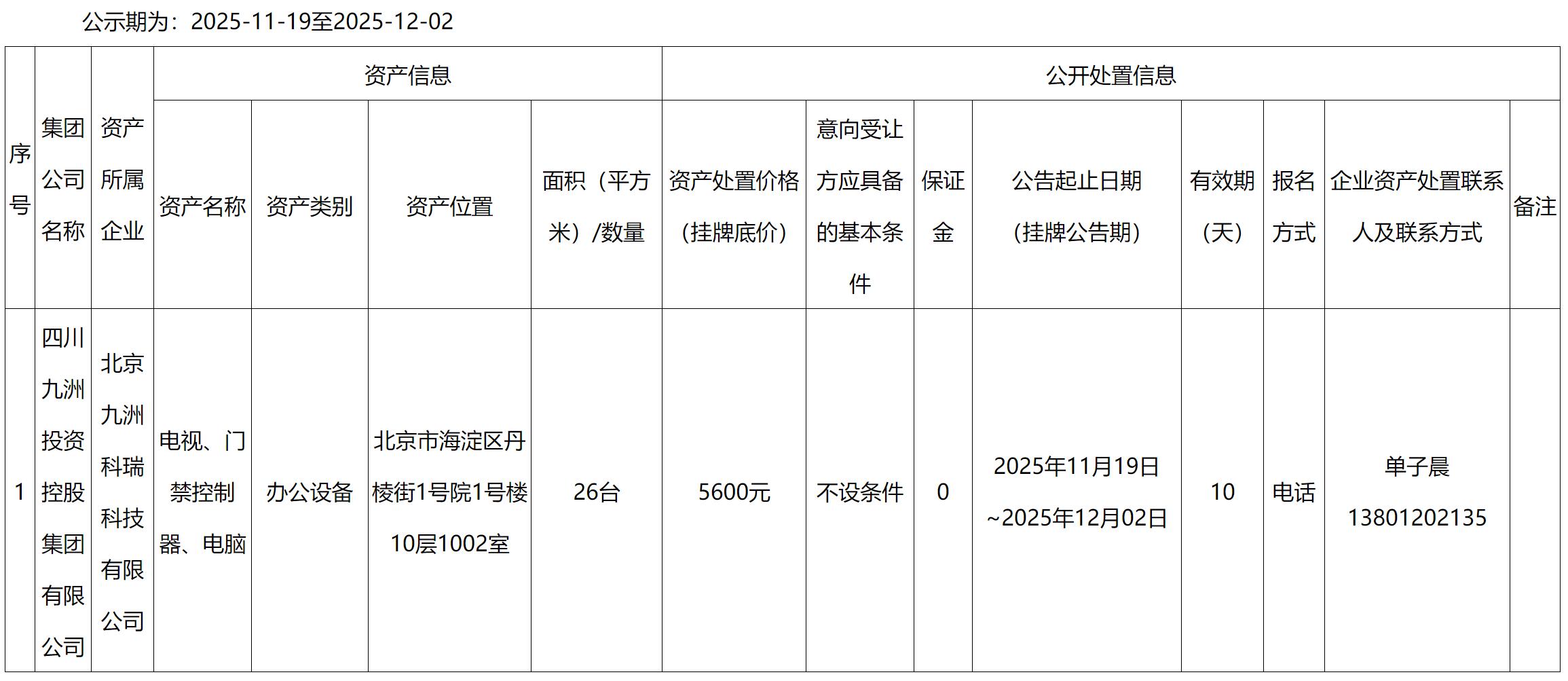 北京九洲科瑞科技有限公司电视、电脑等资产处置公告
