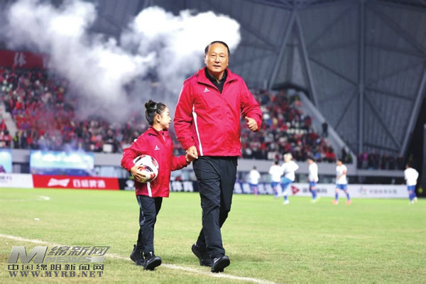 10月25日晚,川超绵阳九洲长虹队对阵广元剑门雄关队的比赛现场,中国工程物理研究院(简称“中物院”)老一辈科研工作者子弟、四川省足球协会原秘书长李日新,与中物院新生代科研工作者子女、绵阳科学城春蕾学校学生韩思媛,携手为比赛开球。