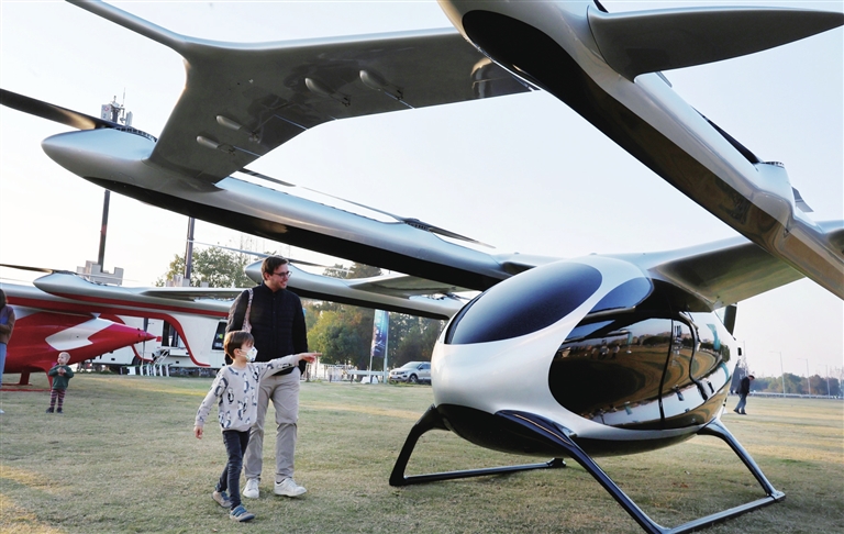 11月22日,在峰飞航空全球科技日活动上,人们观看电动垂直起降飞行器。 新华社记者 方喆 摄