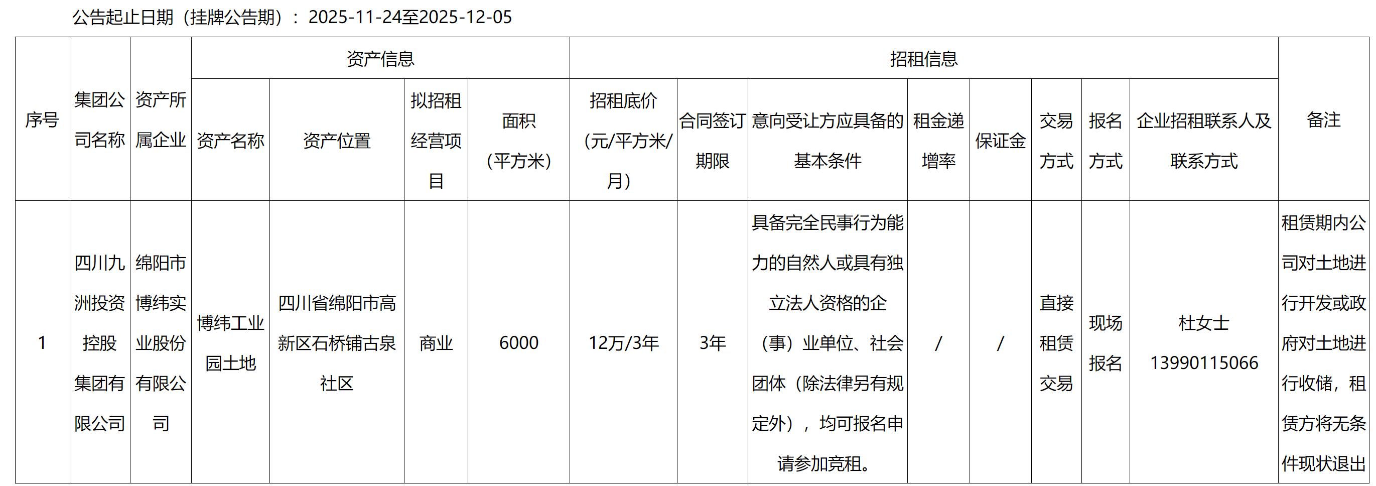 四川九洲千城商业管理有限公司园区项目部代管资产出租公告