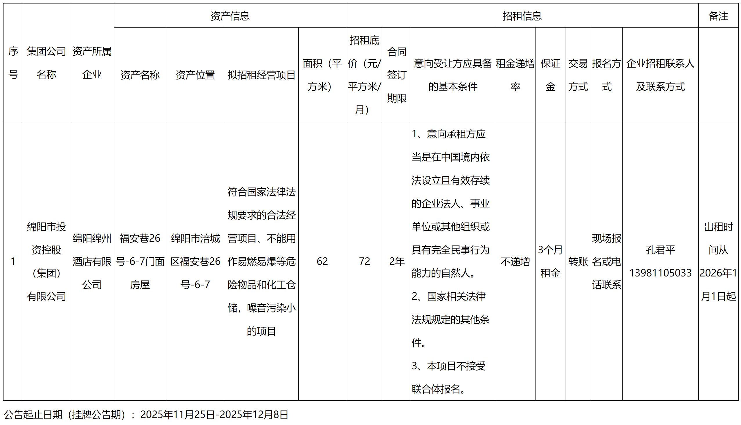 绵阳绵州酒店有限公司资产招租信息公告