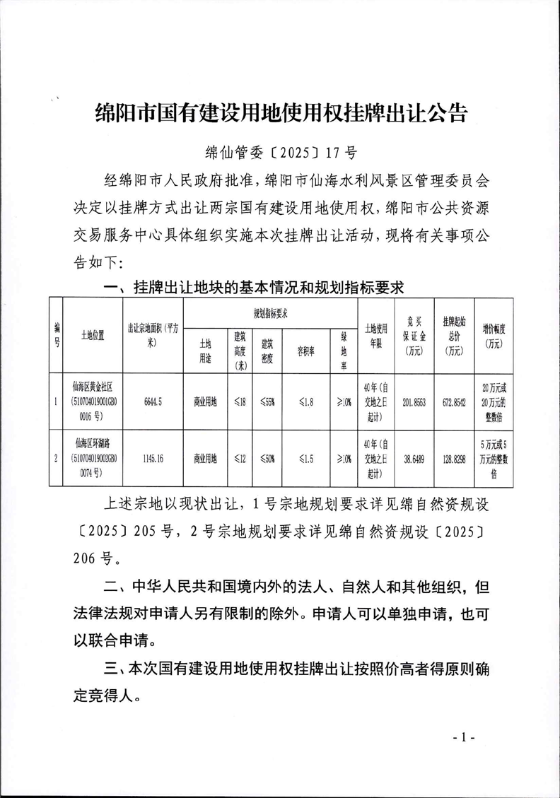 绵阳市国有建设用地使用权挂牌出让公告(绵仙管委〔2025号〕17号)