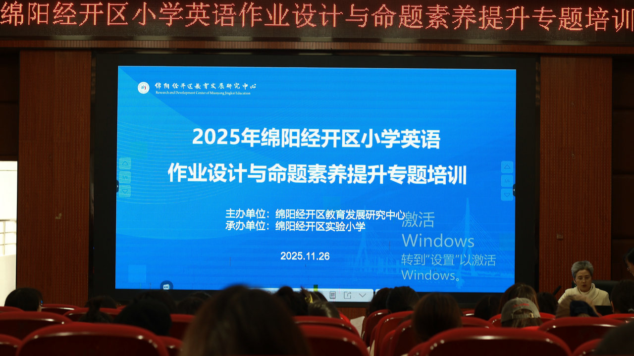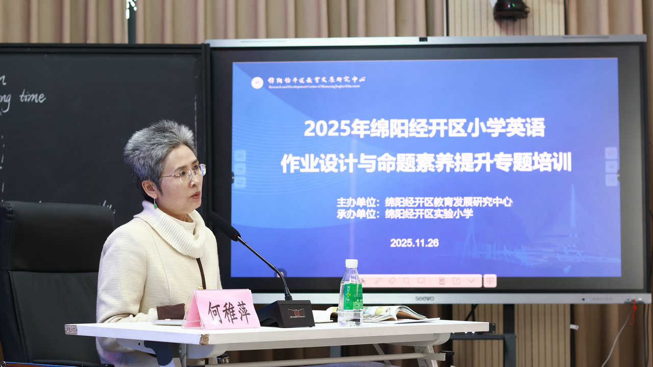 11月26日,2025年绵阳经开区小学英语作业设计与命题素养提升专题培训在经开区实验小学举行,区内全体小学英语教师参与培训,共同探索核心素养导向下的教学提质路径。