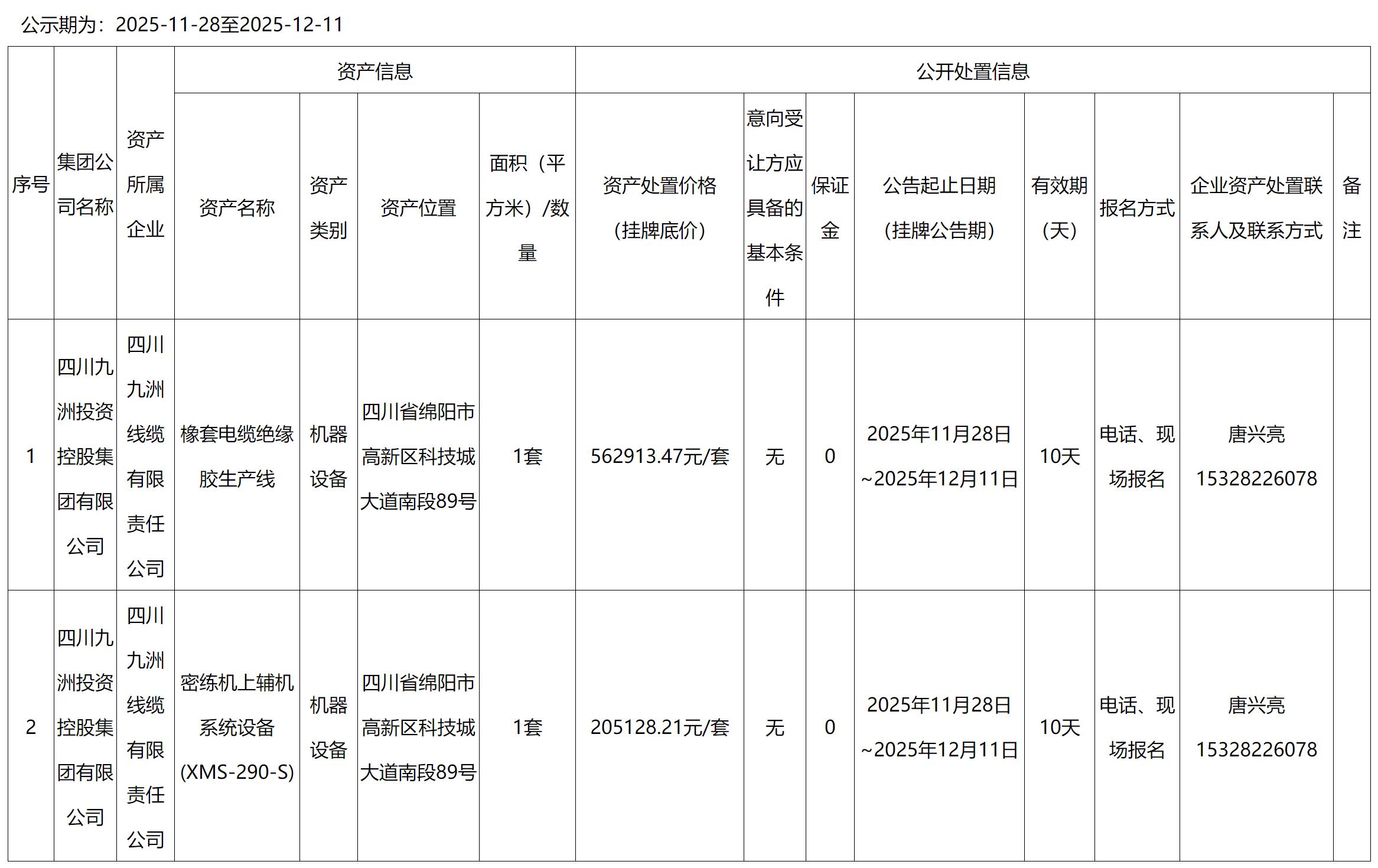 四川九洲线缆有限责任公司橡胶生产设备资产处置公告
