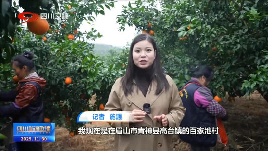 记者 施源:现在正值晚熟柑橘的丰收季,我现在是在眉山市青神县高台镇的百家池村。这里有一个晚熟柑橘基地,柑橘品种多达9种,而种植面积达3000多亩。