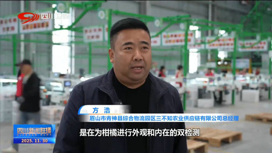 眉山市青神县综合物流园区三不知农业供应链有限公司总经理 方浩:智能分选设备它主要的功能是在为柑橘进行外观和内在的双检测。目前像这样的分选线,在我们的物流车间大概有五条左右,每天可以分选柑橘大概在50万斤到80万斤。