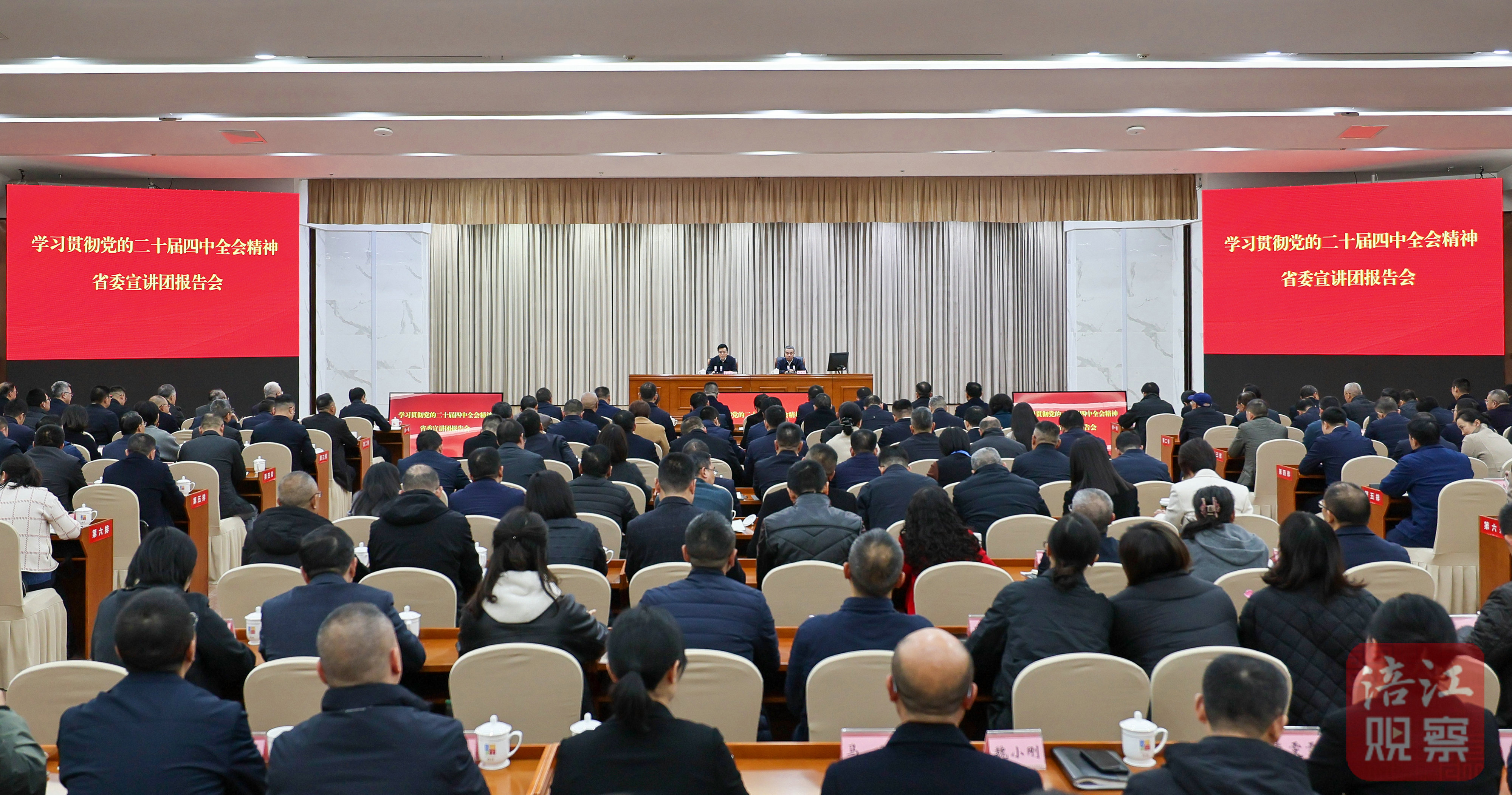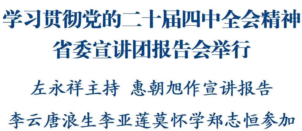 根据省委统一部署,12月3日,学习贯彻党的二十届四中全会精神省委宣讲团报告会举行。省委常委、市委书记左永祥主持报告会。省委宣讲团第九分团负责人,省商务厅党组书记、厅长惠朝旭作宣讲报告。市委副书记、市长李云,市人大常委会主任唐浪生,市政协主席李亚莲,市委副书记、政法委书记莫怀学,市委常委、科技城管委会主任郑志恒参加。