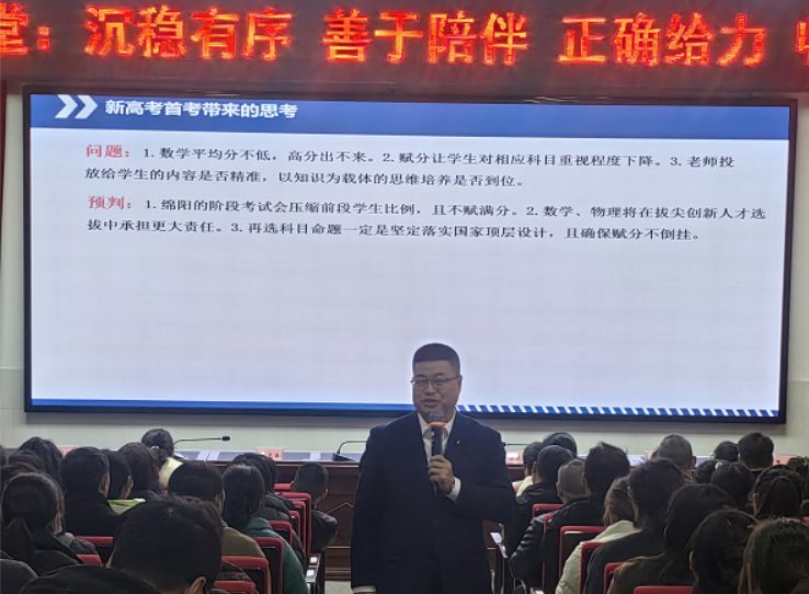 家校协同,筑牢成长根基。家校同频聚合力,春风化雨助成长。 会议伊始,年级主任赵汝顺以绵阳一诊阶段性成果为切入点,结合新高考改革背景展开深度剖析。他着重强调,高三是学生成长的关键阶段,呼吁家长从日常监督管理、后勤服务保障、家校协同共育三个维度发力,全方位助力孩子平稳度过这一重要时期。