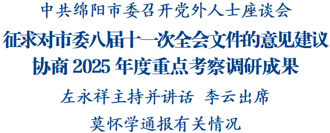中共绵阳市委八届十一次全会举行前夕,市委召开党外人士座谈会,就全会文件听取各民主党派市(工)委会、市工商联负责人和无党派人士代表的意见和建议,并就2025年度重点考察调研成果进行协商。省委常委、市委书记左永祥主持座谈会并讲话。