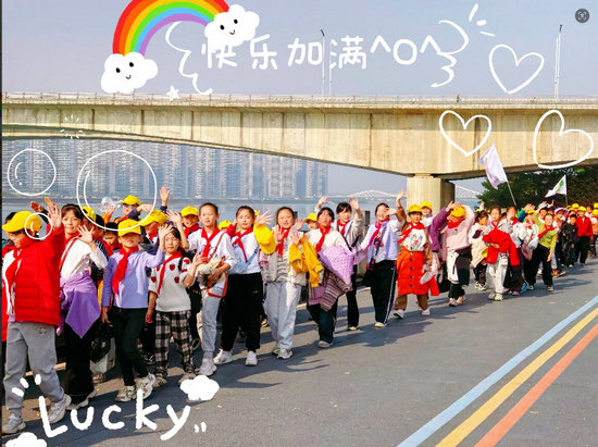 活动伊始,全校师生精神抖擞。同学们身着统一秋季校服,头戴小黄帽,胸前崭新的红领巾格外耀眼。在班旗的引领下,队伍浩浩荡荡出发。低年级同学往返约6公里,高年级同学更是挑战了往返12公里的路程。漫长的路途是对体力的考验,更是对意志的磨砺。没有一位同学轻言放弃,大家相互鼓励,歌声与口号声此起彼伏,用实际行动诠释了“强体魄”与“勇担当”的深刻内涵。