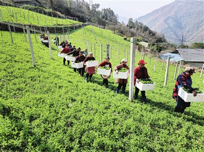 初冬的田间,一片绿意惹人注目。北川坝底乡金山村村民们把装箱好的有机豌豆尖送往集中点。 记者 唐云峰 摄