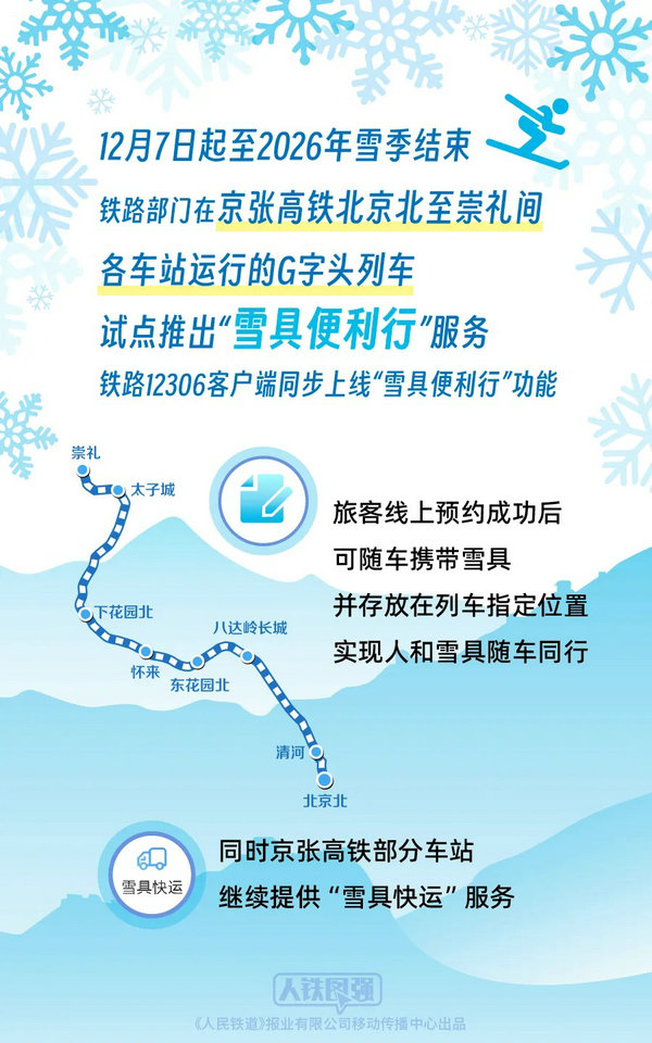 12月7日起至2026年雪季结束,铁路部门在京张高铁北京北至崇礼间各车站运行的G字头列车试点推出“雪具便利行”服务,铁路12306客户端同步上线“雪具便利行”功能,旅客线上预约成功后可随车携带雪具并存放在列车指定位置,实现人和雪具随车同行,同时京张高铁部分车站继续提供“雪具快运”服务,“坐着高铁去滑雪”将更加方便快捷。
