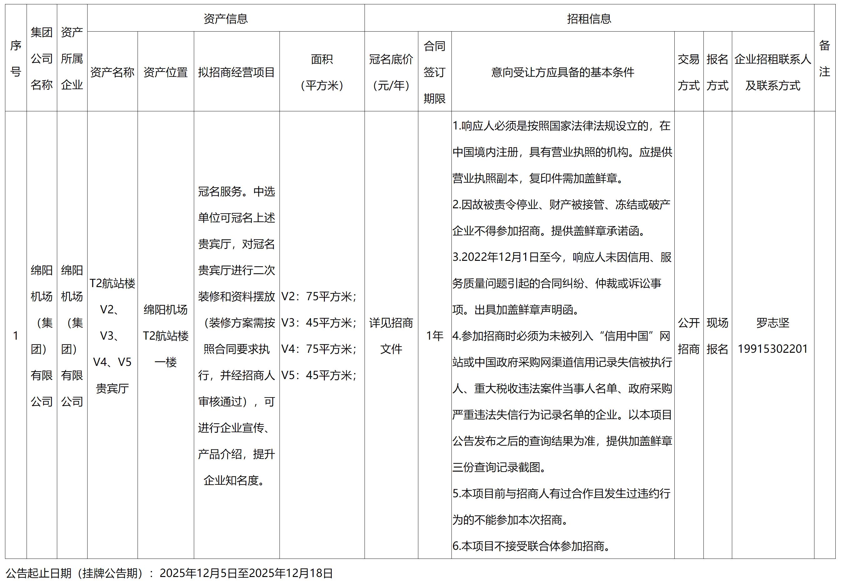 绵阳机场T2航站楼贵宾厅冠名服务招商项目招商公告