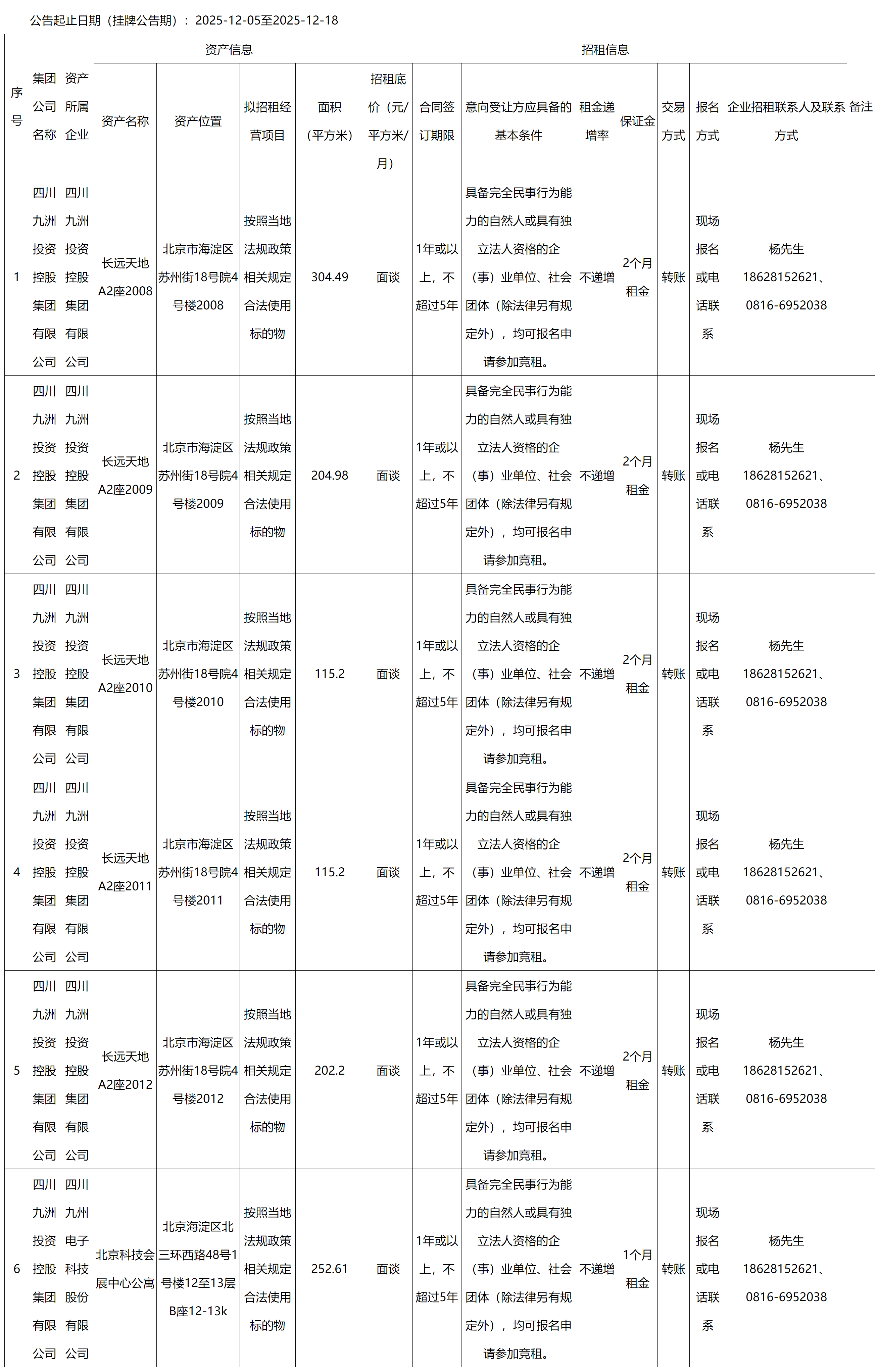 四川九洲千城商业管理有限公司北京项目部北京长远天地A2座、北京科技会展中心房屋出租公告