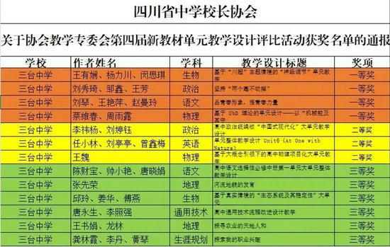 绵阳新闻网讯 近日,三台中学教师在四川省中学校长协会教学专委会第四届新教材单元教学设计评比活动荣获四个一等奖、三个二等奖!