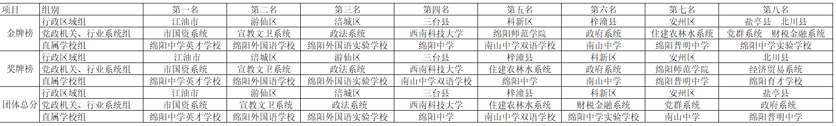 其中,江油市、绵阳市国资系统、绵阳中学英才学校成绩亮眼,包揽各组别金牌榜、奖牌榜、团体总分三项第一名。