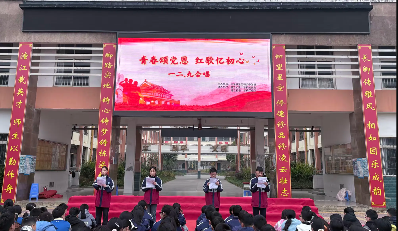 为了纪念 “一二?九”爱国运动 90 周年,弘扬爱国主义精神,厚植师生爱国情怀,12 月 9 日下午,梓潼县潼江初级中学校举行了以 “青春颂党恩?红歌忆初心”为主题的纪念 “12?9” 校园红歌比赛暨新团员入团仪式。全校师生齐聚一堂,以嘹亮红歌追忆峥嵘岁月,以青春誓言践行初心使命。