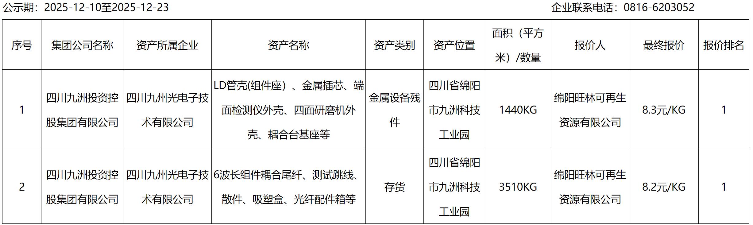 四川九州光电子技术有限公司积压物资、报废设备资产处置结果公示