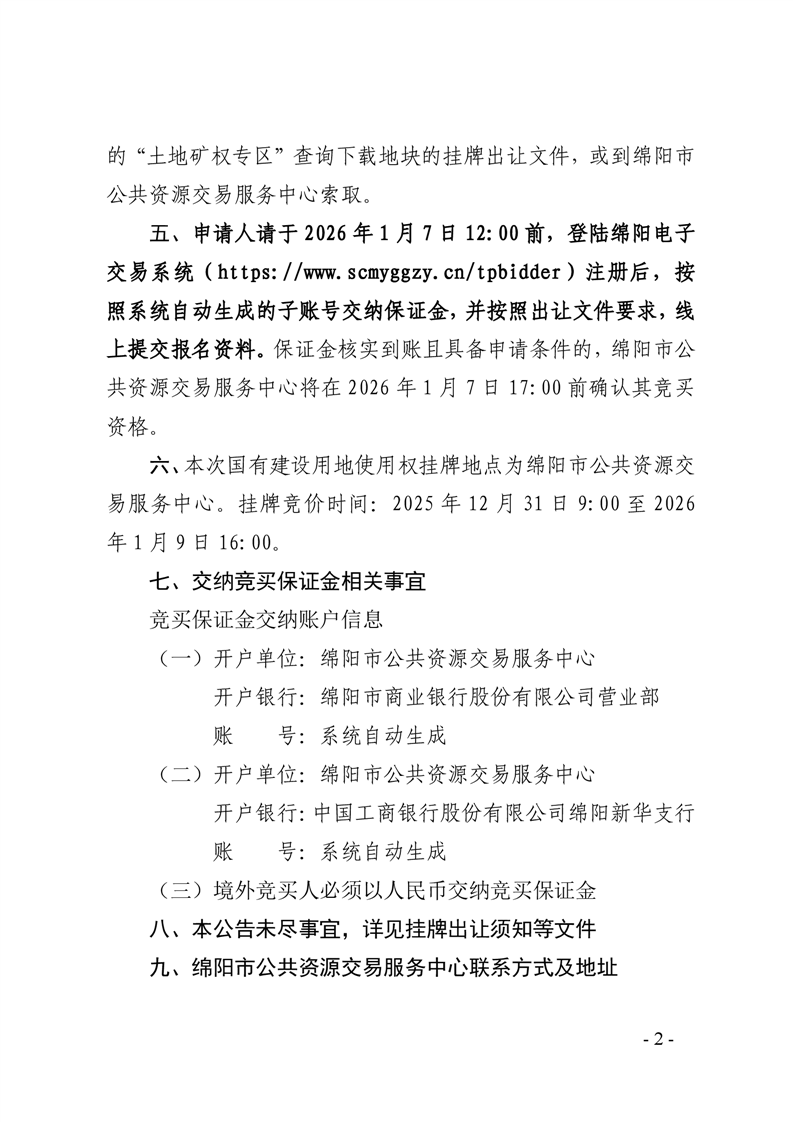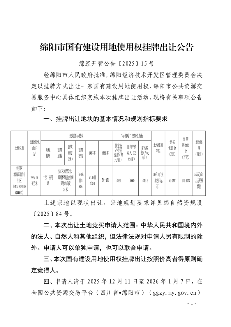 绵阳市国有建设用地使用权挂牌出让公告(绵经开管公告〔2025〕15号)